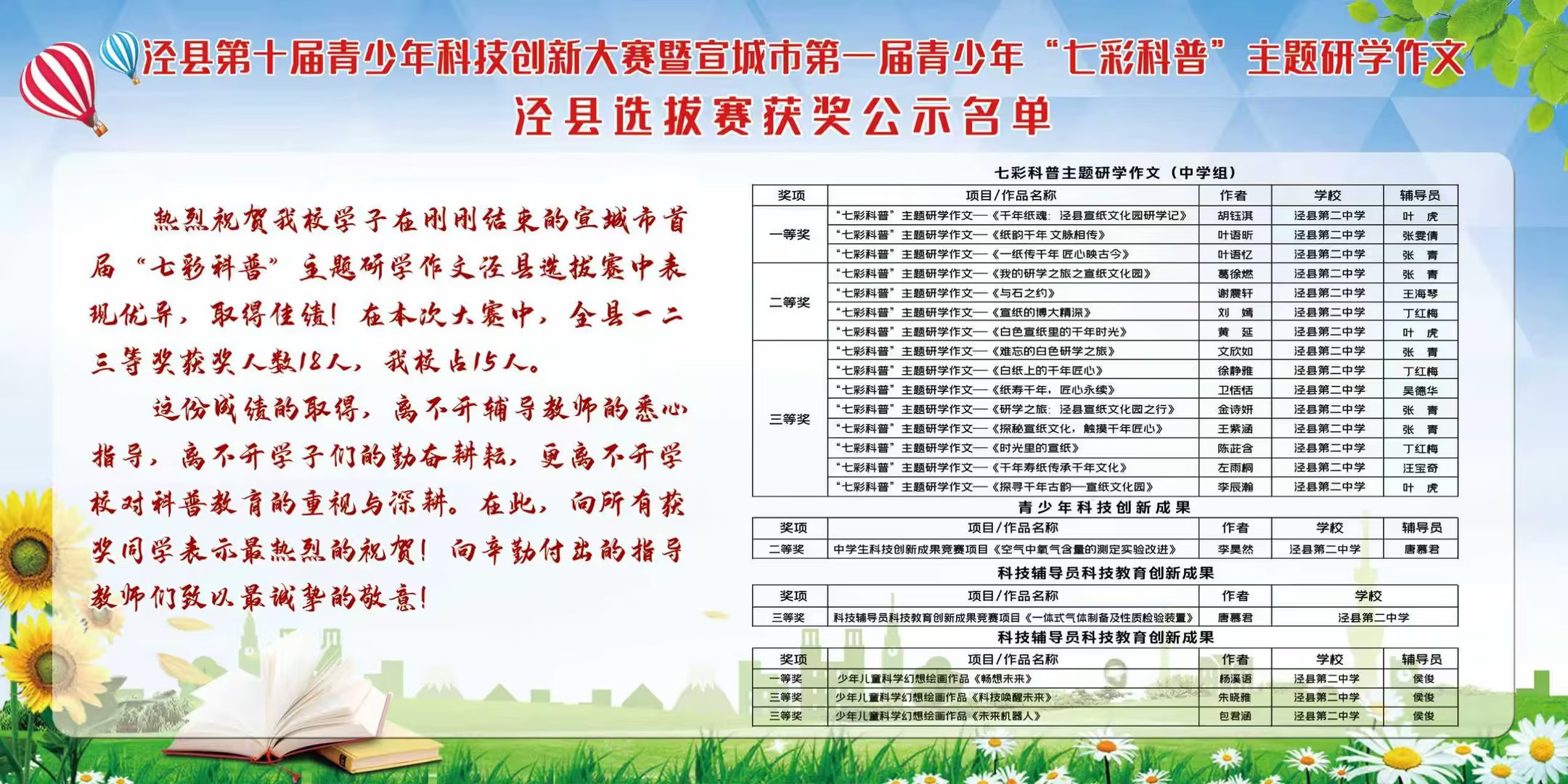 日前,泾县第十届青少年科技创新大赛暨宣城市首届“七彩科普”主题研学作文大赛泾县选拔赛落下帷幕,我校学子表现优异,多人获奖!