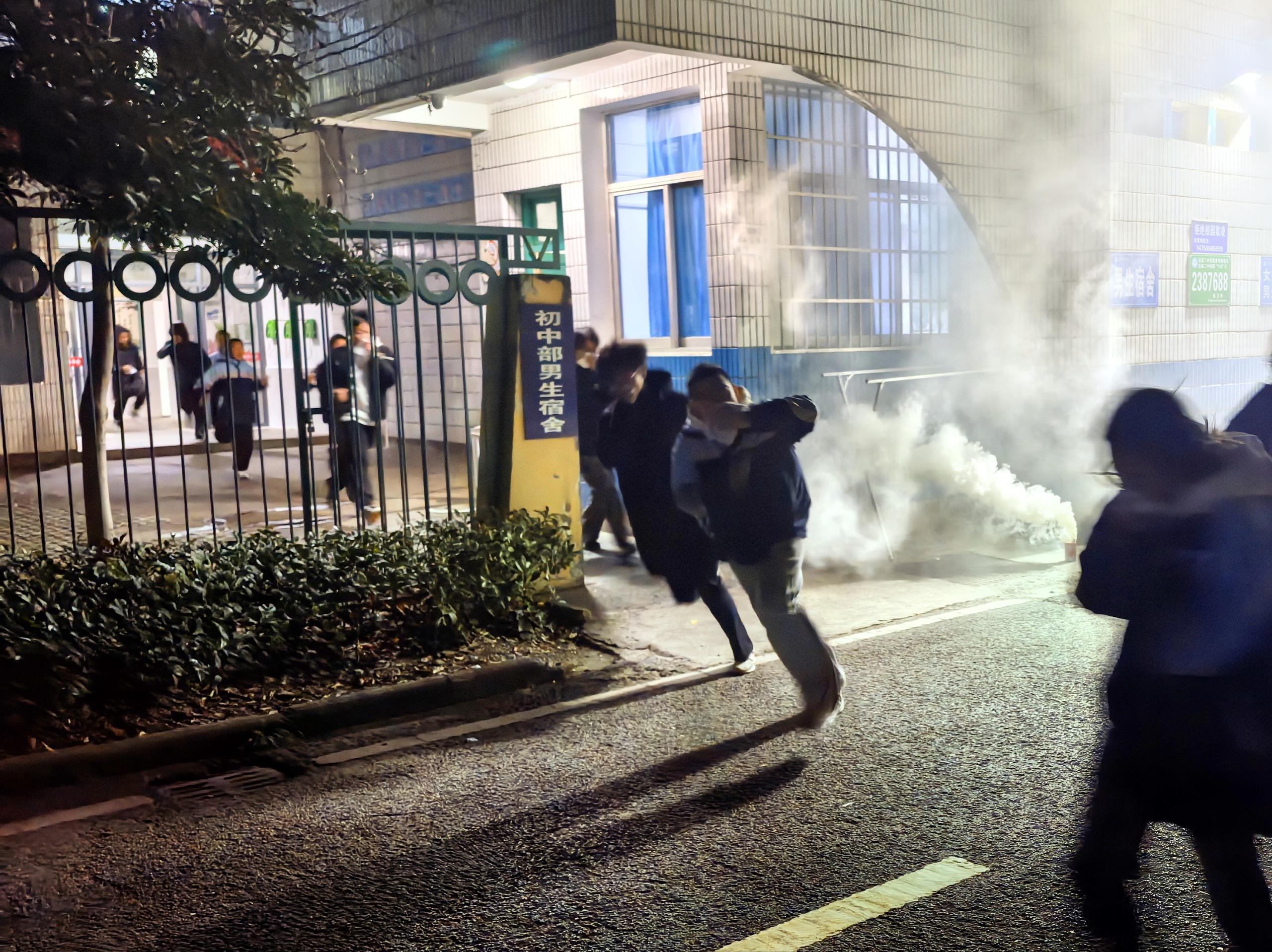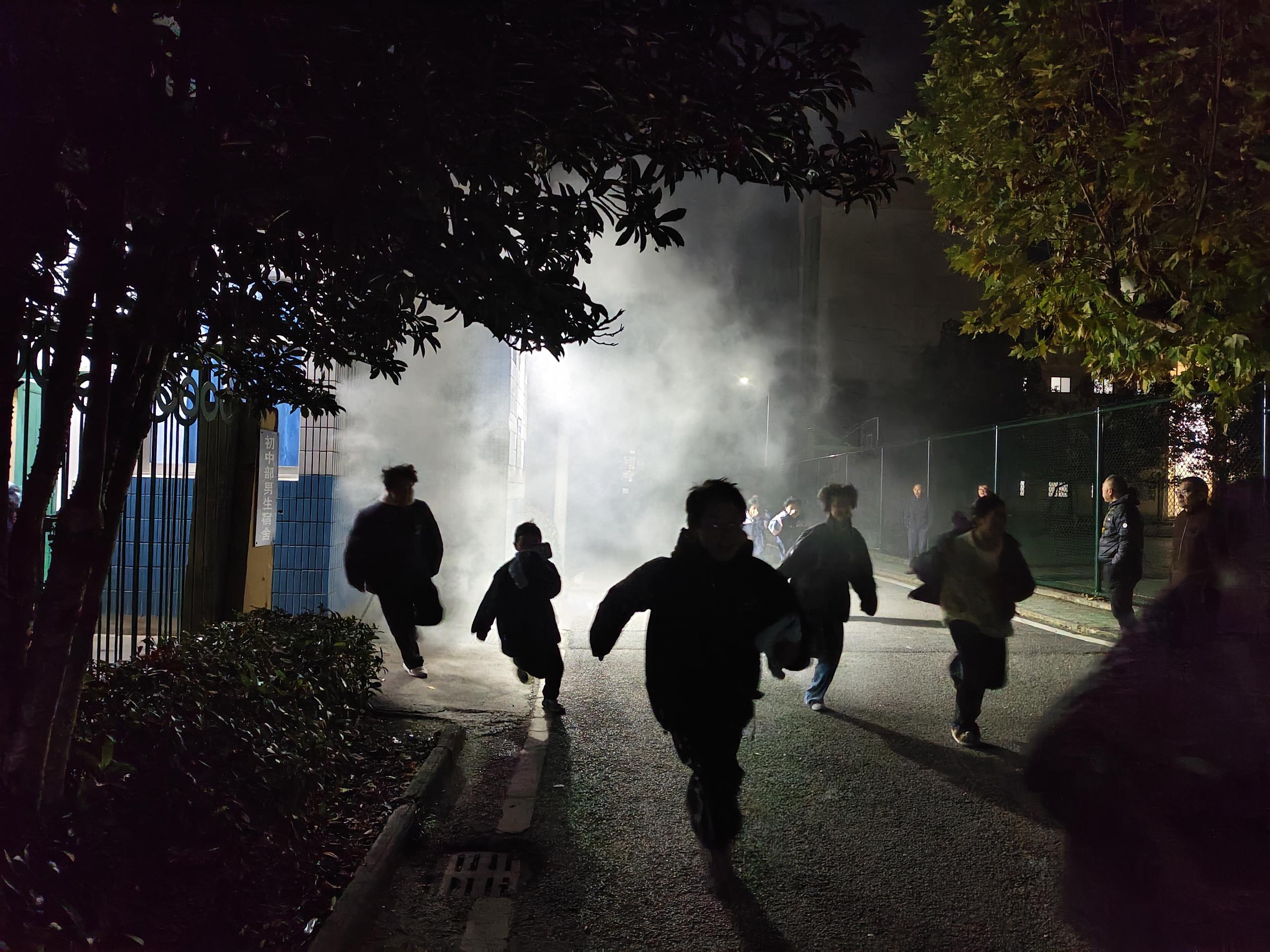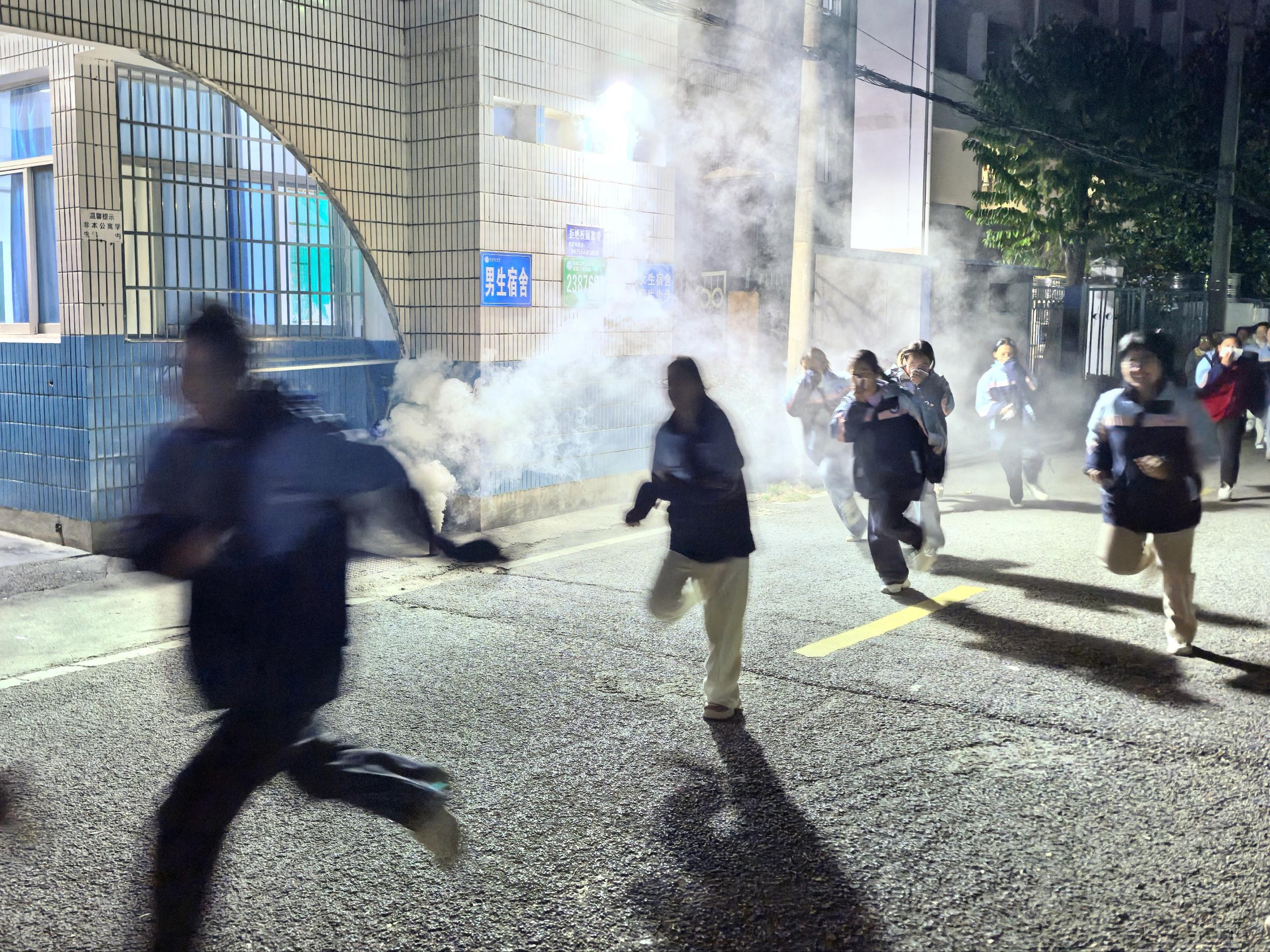 当晚9点10分,随着总指挥胡小云发出哨声信号,演练正式开始。各层联络员立即高声播报:“全体注意,1楼东侧发生火情,请按预案疏散”,迅速启动分级响应机制。寝室里,学生们闻声而动,迅速用湿毛巾捂住口鼻,有序弯腰低姿沿墙行进。楼层引导员(生活指导)手持手电筒全程指引,及时阻止逆向行进等危险行为,保障疏散通道畅通。